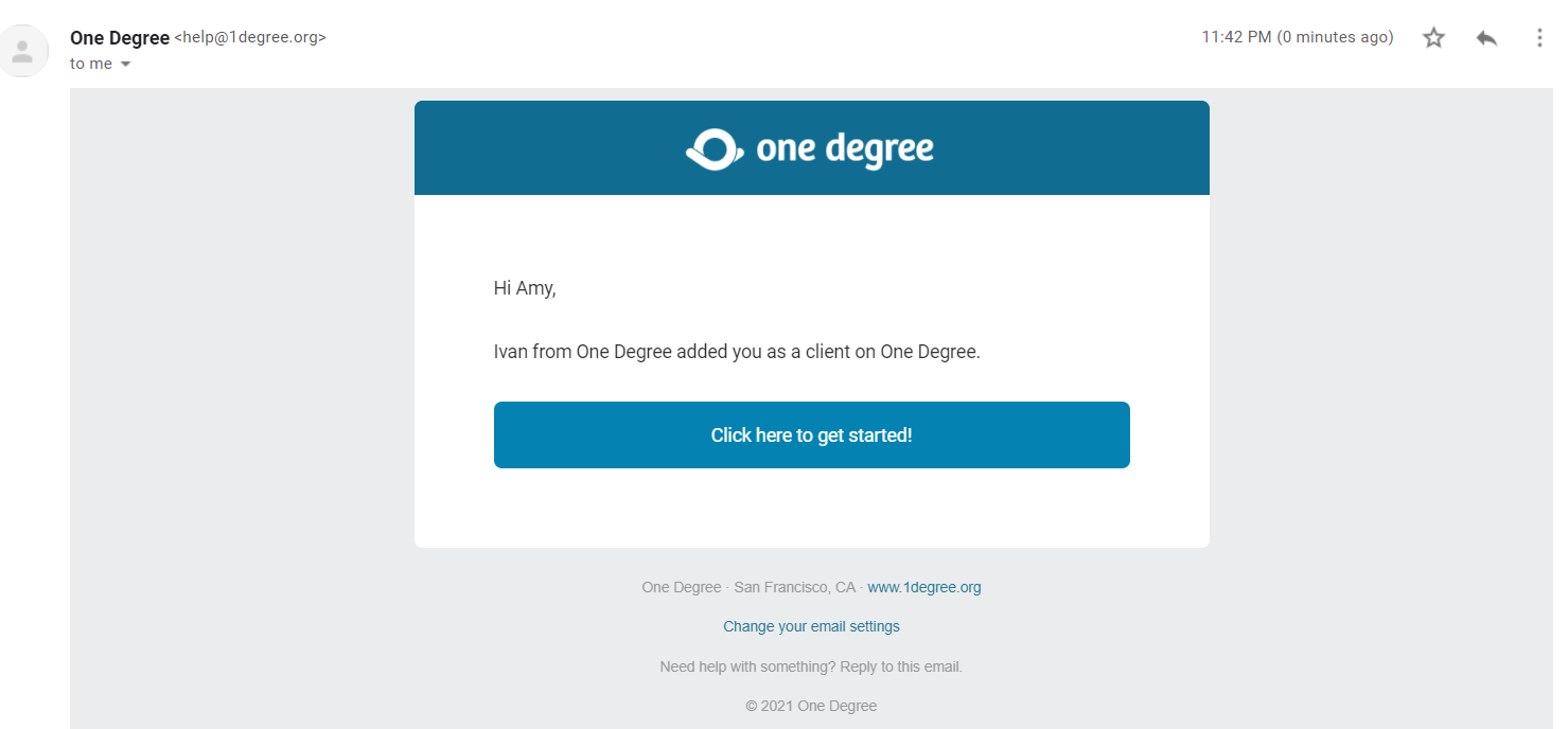 The first message will notify the client that you have added them as a client. The message will include your name, the organization you are affiliated with, and a brief message that resembles the email/text below: