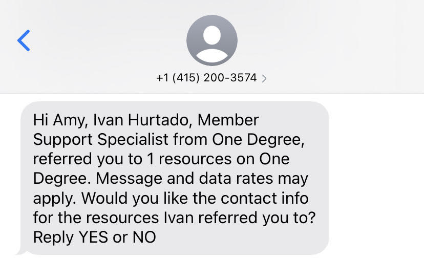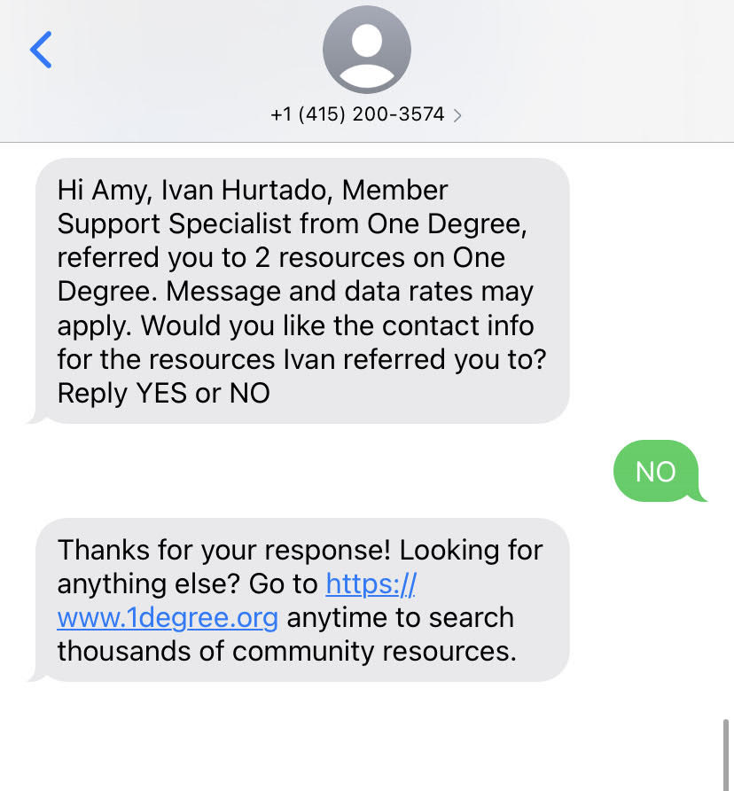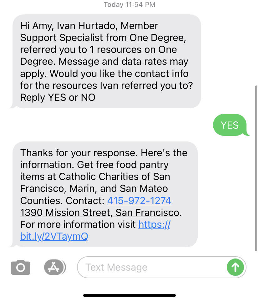If they text back “Yes,” the resource referral link, along with the opportunity contact information and address will be sent.